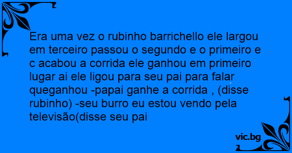 Era uma vez o rubinho barrichello ele largou em terceiro passou o segundo e o primeiro e c acabou a corrida ele ganhou em primeiro lugar ai ele ligou para seu pai para falar queganhou -papai ganhe a corrida , (disse rubinho) -seu вurrо eu estou vendo pela televisão(disse seu pai