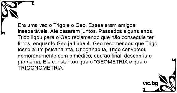 Era uma vez o Trigo e o Geo. Esses eram amigos inseparáveis. Até casaram juntos. Passados alguns anos, Trigo ligou para o Geo reclamando que não conseguia ter filhos, enquanto Geo já tinha 4. Geo recomendou que Trigo fosse a um psicanalista. Chegando lá, Trigo conversou demoradamente com o médico, que ao final, descobriu o problema. Ele constantou que o "GEOMETRIA e que o TRIGONOMETRIA"