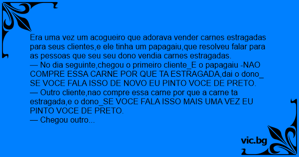 Era uma vez um acogueiro que adorava vender carnes estragadas para seus clientes,e ele tinha um papagaiu,que resolveu falar para as pessoas que seu seu dono vendia carnes estragadas.