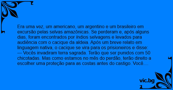 Era uma vez, um americano, um argentino e um brasileiro em excursão pelas selvas amazônicas. Se perderam e, após alguns dias, foram encontrados por índios selvagens e levados para audiência com o cacique da aldeia. Após um breve relato em linguagem nativa, o cacique se vira para os prisioneiros e disse: