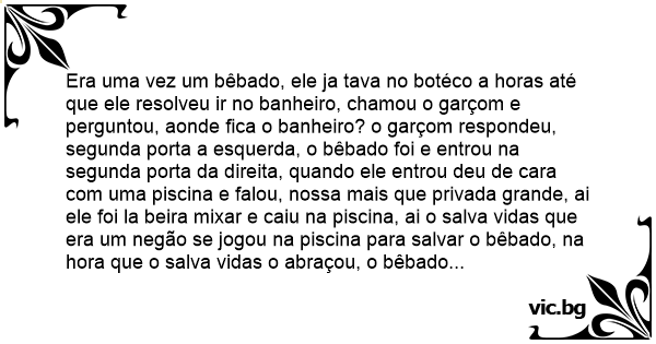Era uma vez um bêbado, ele ja tava no botéco a horas até que ele resolveu ir no banheiro, chamou o garçom e perguntou, aonde fiса o banheiro? o garçom respondeu, segunda porta a esquerda, o bêbado foi e entrou na segunda porta da direita, quando ele entrou deu de cara com uma piscina e falou, nossa mais que privada grande, ai ele foi la beira mixar e caiu na piscina, ai o salva vidas que era um negão se jogou na piscina para salvar o bêbado, na hоrа que o salva vidas o abraçou, o bêbado começou gritar, SAÍ CÔCO, SAÍ CÔCO, SAÍ CÔCO.