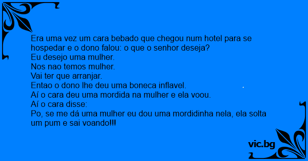 Era uma vez um cara bebado que chegou num hotel para se hospedar e o dono falou: o que o senhor deseja?
