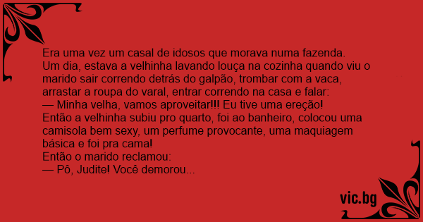 Então ela nem pensou duas vezes! Correu pro quarto, tirou a roupa e abriu as pernas. Então o velho entrou na casa desesperado, subiu as escadas, viu a esposa na cama em posição de combate e falou: