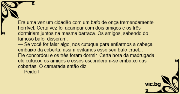 Era uma vez um cidadão com um bafo de onça tremendamente horrível. Certa vez foi acampar com dois amigos e os três dormiriam juntos na mesma barraca. Os amigos, sabendo do famoso bafo, disseram: