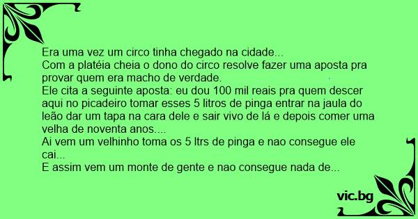 Ele cita a seguinte aposta: eu dou 100 mil reais pra quem descer aqui no picadeiro tomar esses 5 litros de pinga entrar na jaula do leão dar um tapa na cara dele e sair vivo de lá e depois comer uma velha de noventa anos....