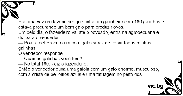 Era uma vez um fazendeiro que tinha um galinheiro com 180 galinhas e estava procurando um bom galo para produzir ovos.