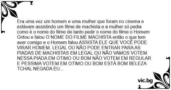 Era uma vez um homem e uma mulher que foram no cinema e estávam assistindo um filme de machista e a mulher só pedia como é o nome do filme de tanto pedir o nome do filme o Homem Gritou e falou O NOME DO FILME MACHISTA então o que tem aver comigo e o Homem falou ASSISTA ELE QUE VOCÊ PODE VIRAR HOMEM. LEGAL OU NÃO PODE ENTRAR PARA AS PIADAS DE MACHISTAS EM LEGAL OU NÃO VAMOS VOTEM NESSA PIADA EM OTIMO OU BOM NÃO VOTEM EM REGULAR E PESSIMA VOTEM EM OTIMO OU BOM ESTÁ BOM BELEZA TCHAL NEGADA EU TENQUE IR ESTÁ BOM VOTEM EM O QUE EU FALEI TCHAU.