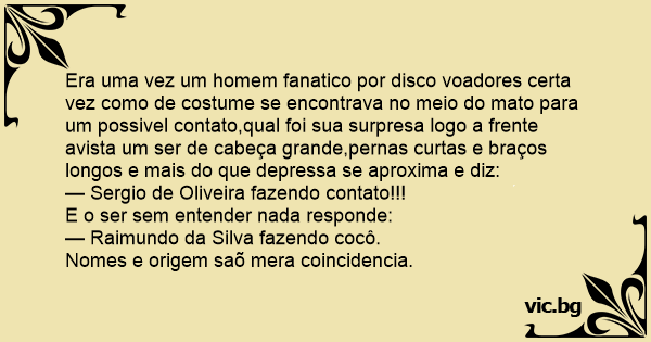 Era uma vez um homem fanatico por disco voadores certa vez como de costume se encontrava no meio do mato para um possivel contato,qual foi sua surpresa logo a frente avista um ser de cabeça grande,pernas curtas e braços longos e mais do que depressa se aproxima e diz: