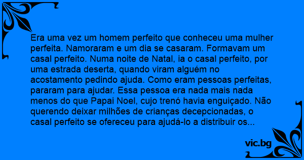 Era uma vez um homem perfeito que conheceu uma mulher perfeita. Namoraram e um dia se casaram. Formavam um casal perfeito. Numa noite de Natal, ia o casal perfeito, por uma estrada deserta, quando viram alguém no acostamento pedindo ajuda. Como eram pessoas perfeitas, pararam para ajudar. Essa pessoa era nada mais nada menos do que Papai Noel, cujo trenó havia enguiçado. Não querendo deixar milhões de crianças decepcionadas, o casal perfeito se ofereceu para ajudá-lo a distribuir os presentes. O bom velhinho entrou no carro e lá foram eles. Infelizmente, o carro se envolveu em um acidente e somente um dos três ocupantes sobreviveu. Pergunta: Quem foi o sobrevivente do trágico acidente? A mulher perfeita, o homem perfeito ou o Papai Noel?(leia mais abaixo) .