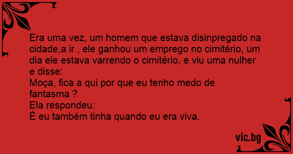 Era uma vez, um homem que estava disinpregado na cidade,a ir , ele ganhou um emprego no cimitério, um dia ele estava varrendo o cimitério, e viu uma nulher e disse: