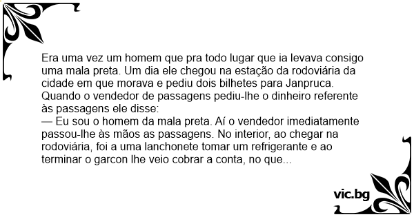 Era uma vez um homem que pra todo lugar que ia levava consigo uma mala preta. Um dia ele chegou na estação da rodoviária da cidade em que morava e pediu dois bilhetes para Janpruca. Quando o vendedor de passagens pediu-lhe o dinheiro referente às passagens ele disse: