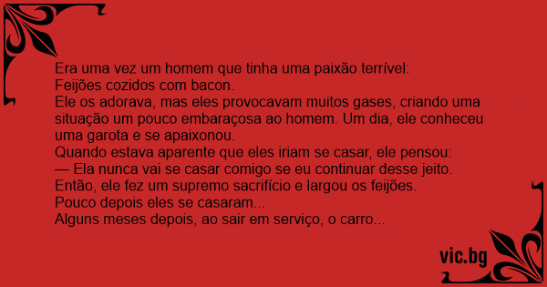 Não teve dúvidas, entrou e pediu, babando, duas porções caprichadas de feijões. Já retornando para casa, sua volta foi marcada por estrondosos e contínuos gases, os quais, sem o menor constrangimento ou inibição, ele soltava com um misto de prazer e realização.