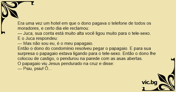 Então o dono do condomínio resolveu pegar o papagaio. E para sua surpresa o papagaio estava ligando para o tele-sеxо. Então o dono lhe colocou de castigo, o pendurou na parede com as asas abertas.