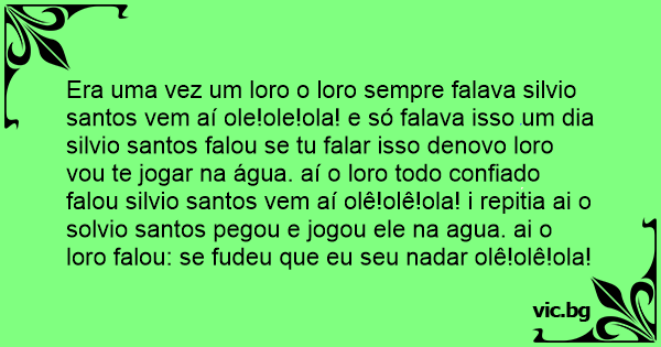 Era uma vez um loro o loro sempre falava silvio santos vem aí ole!ole!ola! e só falava isso um dia silvio santos falou se tu falar isso denovo loro vou te jogar na água. aí o loro todo confiado falou silvio santos vem aí olê!olê!ola! i repitia ai o solvio santos pegou e jogou ele na agua. ai o loro falou: se fudeu que eu seu nadar olê!olê!ola!