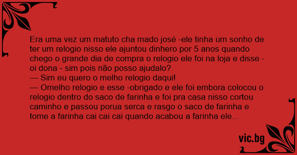 Era uma vez um matuto cha mado josé -ele tinha um sonho de ter um relogio nisso ele ajuntou dinhero por 5 anos quando chego o grande dia de compra o relogio ele foi na loja e disse -oi dona - sim pois não posso ajudalo?