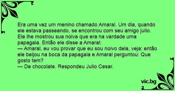 — Amaral, eu vou provar que eu sou noivo dela, veja: então ele beijou na boca da papagaia e Amaral perguntou: Que gosto tem?