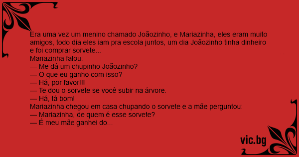 Era uma vez um menino chamado Joãozinho, e Mariazinha, eles eram muito amigos, todo dia eles iam pra escola juntos, um dia Joãozinho tinha dinheiro e foi comprar sorvete...
