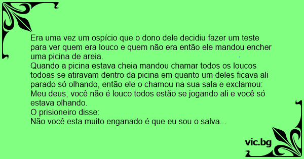 Era uma vez um ospício que o dono dele decidiu fazer um теsте para ver quem era louco e quem não era então ele mandou encher uma picina de areia.