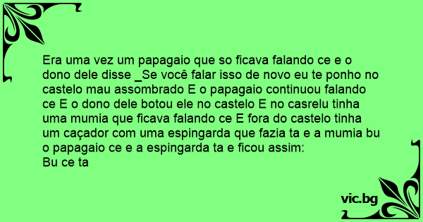 Era uma vez um papagaio que so ficava falando ce e o dono dele disse _Se você falar isso de novo eu te ponho no castelo mau assombrado E o papagaio continuou falando ce E o dono dele botou ele no castelo E no casrelu tinha uma mumia que ficava falando ce E fora do castelo tinha um caçador com uma espingarda que fazia ta e a mumia bu o papagaio ce e a espingarda ta e ficou assim: