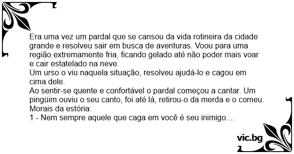 Ao sentir-se quente e confortável o pardal começou a cantar. Um pingüim ouviu o seu canto, foi até lá, retirou-o da меrdа e o comeu.