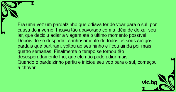Era uma vez um pardalzinho que odiava ter de voar para o sul, por causa do inverno. Ficava tão apavorado com a idéia de deixar seu lar, que decidiu adiar a viagem até o último momento possível. Depois de se despedir carinhosamente de todos os seus amigos pardais que partiram, voltou ao seu ninho e ficou ainda por mais quatro semanas. Finalmente o tempo se tornou tão desesperadamente frio, que ele não pode adiar mais.