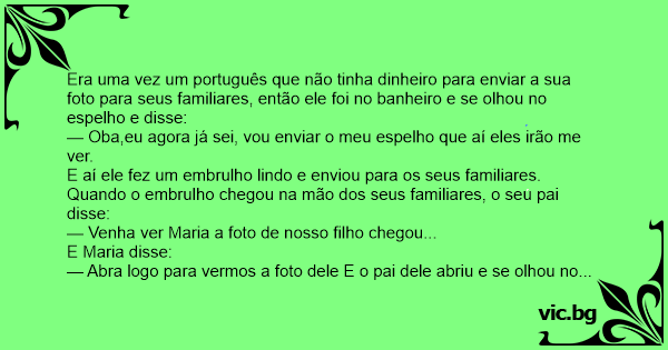 Era uma vez um português que não tinha dinheiro para enviar a sua foto para seus familiares, então ele foi no banheiro e se olhou no espelho e disse: