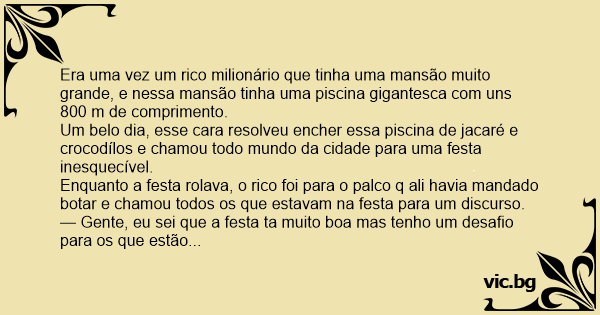 Era uma vez um rico milionário que tinha uma mansão muito grande, e nessa mansão tinha uma piscina gigantesca com uns 800 m de comprimento.
