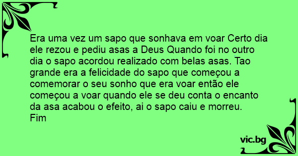 Era uma vez um sapo que sonhava em voar Certo dia ele rezou e pediu asas a Deus Quando foi no outro dia o sapo acordou realizado com belas asas. Tao grande era a felicidade do sapo que começou a comemorar o seu sonho que era voar então ele começou a voar quando ele se deu conta o encanto da asa acabou o efeito, ai o sapo caiu e morreu.