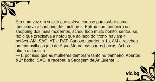 Era uma vez um sujeito que estava curioso para saber como funcionava o banheiro das mulheres. Entrou num banheiro de shopping dos mais modernos, achou tudo muito bonito, sentou-se, fez o que precisava e notou que ao lado do 'trono' haviam 4 botões: AM, SAQ, AT, e RAT. Curioso, apertou o 1o, AM e recebeu um maravilhoso jato de Água Morna nas partes baixas. Achou ótimo e deduziu: