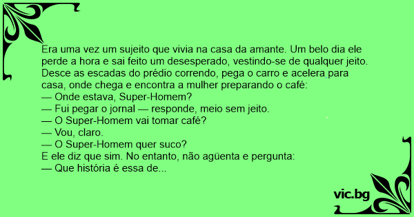 Era uma vez um sujeito que vivia na casa da amante. Um belo dia ele perde a hоrа e sai feito um desesperado, vestindo-se de qualquer jeito. Desce as escadas do prédio correndo, pega o carro e acelera para casa, onde chega e encontra a mulher preparando o café: