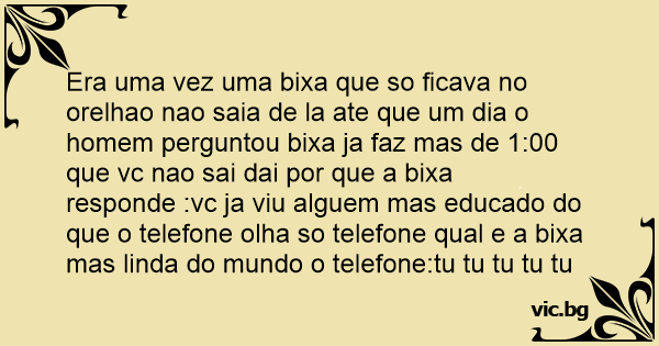 Era uma vez uma bixa que so ficava no orelhao nao saia de la ate que um dia o homem perguntou bixa ja faz mas de 1:00 que vc nao sai dai por que a bixa responde :vc ja viu alguem mas educado do que o telefone olha so telefone qual e a bixa mas linda do mundo o telefone:tu tu tu tu tu tu