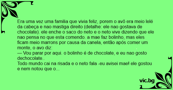Era uma vez uma familia que vivia feliz, porem o avô era meio lelé da cabeça e nao mastiga direito (detalhe: ele nao gostava de chocolate). ele enche o saco do neto e o neto vive dizendo que ele nao pensa no que esta comendo. a mae faz bolinho, mas eles ficam meio marrons por causa da canela, então após comer um monte, o avo diz: