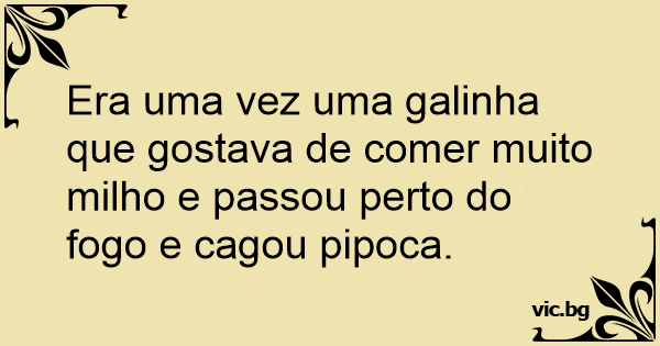 Era uma vez uma gаlinhа que gostava de comer muito milho e passou perto do fogo e cagou pipoca.