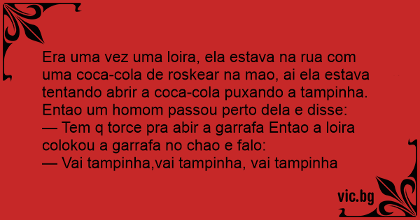 Era uma vez uma loira, ela estava na rua com uma coca-cola de roskear na mao, ai ela estava tentando abrir a coca-cola puxando a tampinha. Entao um homom passou perto dela e disse:
