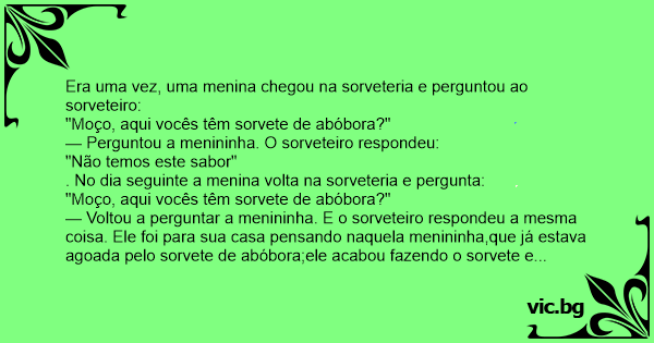 — Voltou a perguntar a menininha. E o sorveteiro respondeu a mesma coisa. Ele foi para sua casa pensando naquela menininha,que já estava agoada pelo sorvete de abóbora;ele acabou fazendo o sorvete e levou para a sorveteria no dia seguinte. Ele estava esperando a menininha que logo estava entrando na sorveteria, perguntou ao sorveteiro::