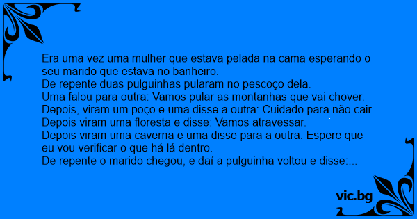 Era uma vez uma mulher que estava pelada na cama esperando o seu marido que estava no banheiro.
