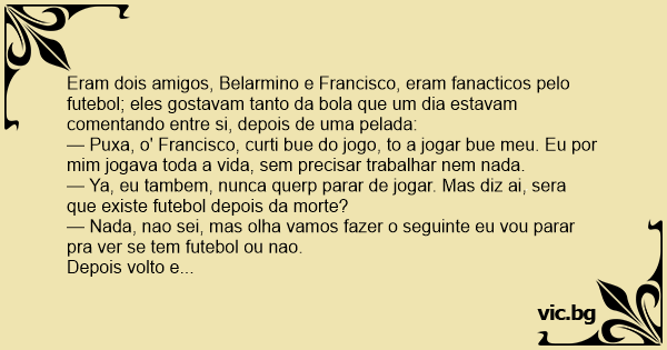 Eram dois amigos, Belarmino e Francisco, eram fanacticos pelo futebol; eles gostavam tanto da bola que um dia estavam comentando entre si, depois de uma pelada:
