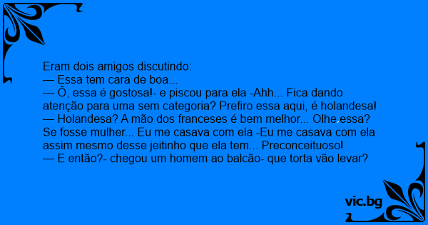 — Holandesa? A mão dos franceses é bem melhor... Olhe essa? Se fosse mulher... Eu me casava com ela -Eu me casava com ela assim mesmo desse jeitinho que ela tem... Preconceituoso!