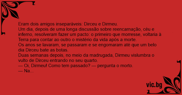 Um dia, depois de uma longa discussão sobre reencarnação, céu e inferno, resolveram fazer um pacto: o primeiro que morresse, voltaria à Terra para contar ao outro o mistério da vida após a morte.