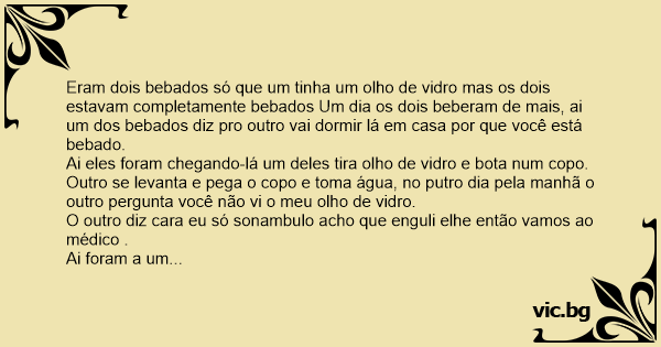 Eram dois bebados só que um tinha um olho de vidro mas os dois estavam completamente bebados Um dia os dois beberam de mais, ai um dos bebados diz pro outro vai dormir lá em casa por que você está bebado.