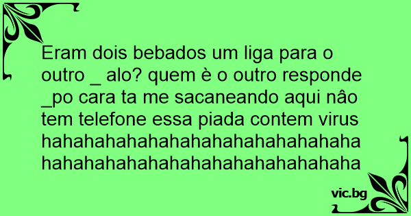 Eram dois bebados um liga para o outro _ alo? quem è o outro responde _po cara ta me sacaneando aqui nâo tem telefone essa piada contem virus hahahahahahahahahahahahahahahahahahahahahahahahahahahahahahahahahahahahahahahahahahahahahahahahah haha nâo adianta mais chora
