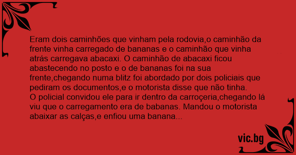 Eram dois caminhões que vinham pela rodovia,o caminhão da frente vinha carregado de bananas e o caminhão que vinha atrás carregava abacaxi. O caminhão de abacaxi ficou abastecendo no posto e o de bananas foi na sua frente,chegando numa blitz foi abordado por dois policiais que pediram os documentos,e o motorista disse que não tinha.