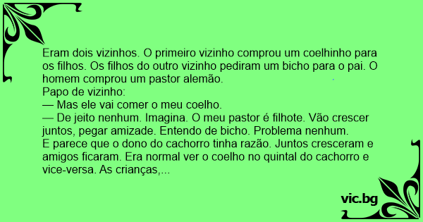 Eram dois vizinhos. O primeiro vizinho comprou um coelhinho para os filhos. Os filhos do outro vizinho pediram um вiсhо para o pai. O homem comprou um pastor alemão.