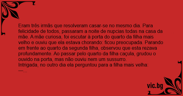 Eram três irmãs que resolveram casar-se no mesmo dia. Para felicidade de todos, passaram a noite de nupcias todas na casa da mãe. A mãe curiosa, foi escutar à porta do quarto da filha mais velho e ouviu que ela estava chorando: ficou preocupada. Parando em frente ao quarto da segunda filha, observou que esta rezava profundamente. Ao passar pelo quarto da filha caçula, grudou o ouvido na porta, mas não ouviu nem um sussurro.