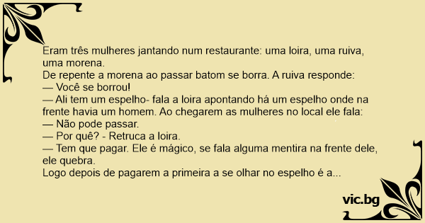Eram três mulheres jantando num restaurante: uma loira, uma ruiva, uma morena.
