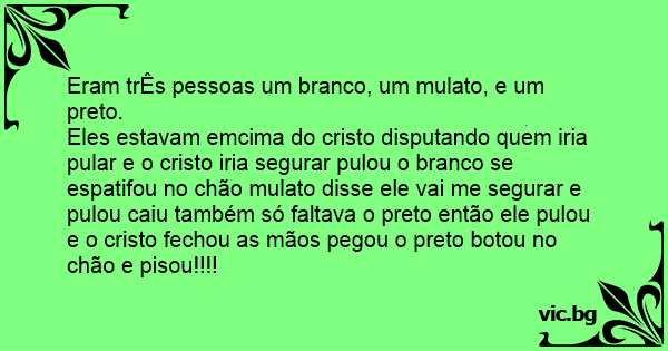 Eles estavam emcima do cristo disputando quem iria pular e o cristo iria segurar pulou o branco se espatifou no chão mulato disse ele vai me segurar e pulou caiu também só faltava o preto então ele pulou e o cristo fechou as mãos pegou o preto botou no chão e pisou!!!!