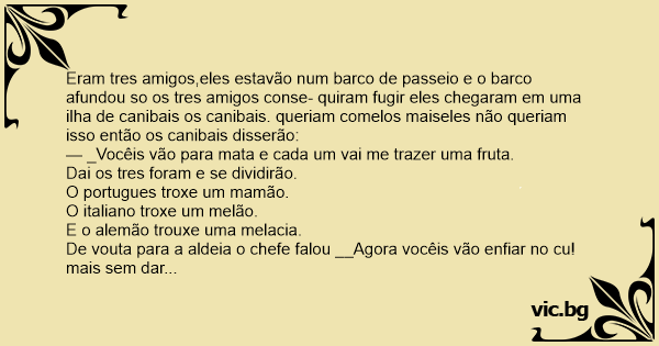 Eram tres amigos,eles estavão num barco de passeio e o barco afundou so os tres amigos conse- quiram fugir eles chegaram em uma ilha de canibais os canibais. queriam comelos maiseles não queriam isso então os canibais disserão: