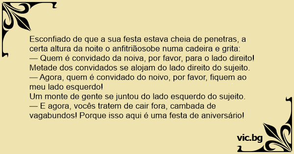 Esconfiado de que a sua festa estava cheia de penetras, a certa altura da noite o anfitriãosobe numa cadeira e grita: