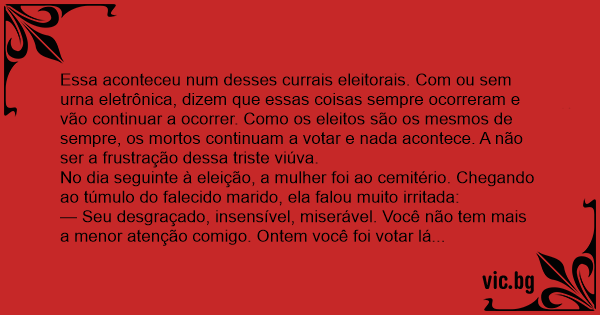Essa aconteceu num desses currais eleitorais. Com ou sem urna eletrônica, dizem que essas coisas sempre ocorreram e vão continuar a ocorrer. Como os eleitos são os mesmos de sempre, os mortos continuam a votar e nada acontece. A não ser a frustração dessa triste viúva.