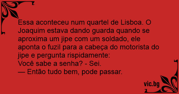 Essa aconteceu num quartel de Lisboa. O Joaquim estava dando guarda quando se aproxima um jipe com um soldado, ele aponta o fuzil para a cabeça do motorista do jipe e pergunta rispidamente: